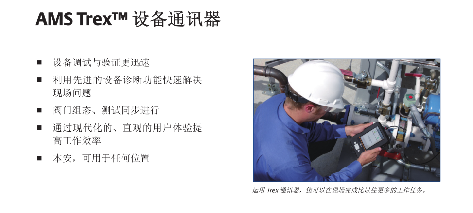 阀门问题的诊断及维修特别昂贵,现场技术人员通常需要拆下阀门以调查故障,而拆除阀门进行检查通常意味着生产停车。对于更为复杂的故障维修,技术人员通常需对阀门解体以确定故障的根本原因,而这又常常会导致阀门的进一步损坏,从而花费更多的时间以及进行更昂贵的维修。使用 Trex 单元上的 ValveLink Mobile 应用程序,您可以在现场执行阀门诊断,如阀门特性、动态误差带、PD 一键扫描和阶跃响应,而无需拆下阀门或执行侵入性故障排除步骤。ValveLink Mobile 支持HART 和 FF 型 Fisher ® FIELDVUE TM 数字阀门定位器,提供易于理解和使用的直观用户界面。Trex 通讯器的大触摸屏将使您比以往任何时候都能更加容易地看清所有阀门的诊断情。